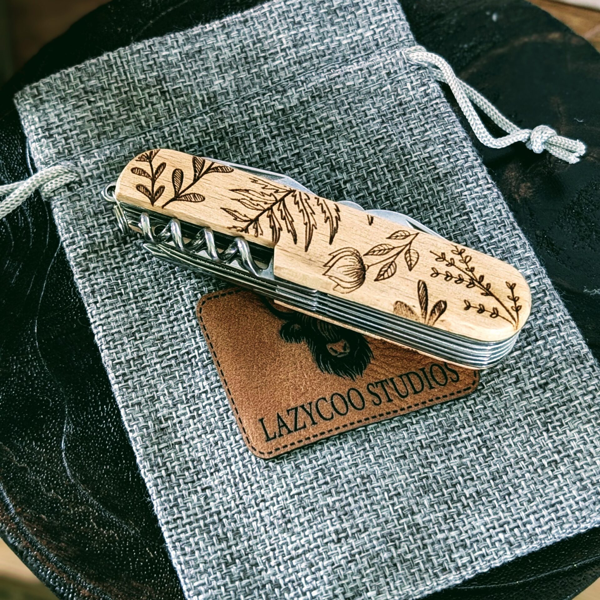 Handcrafted in our home studio, our Laser engraved beech wood multi tool floral make a unique gift!