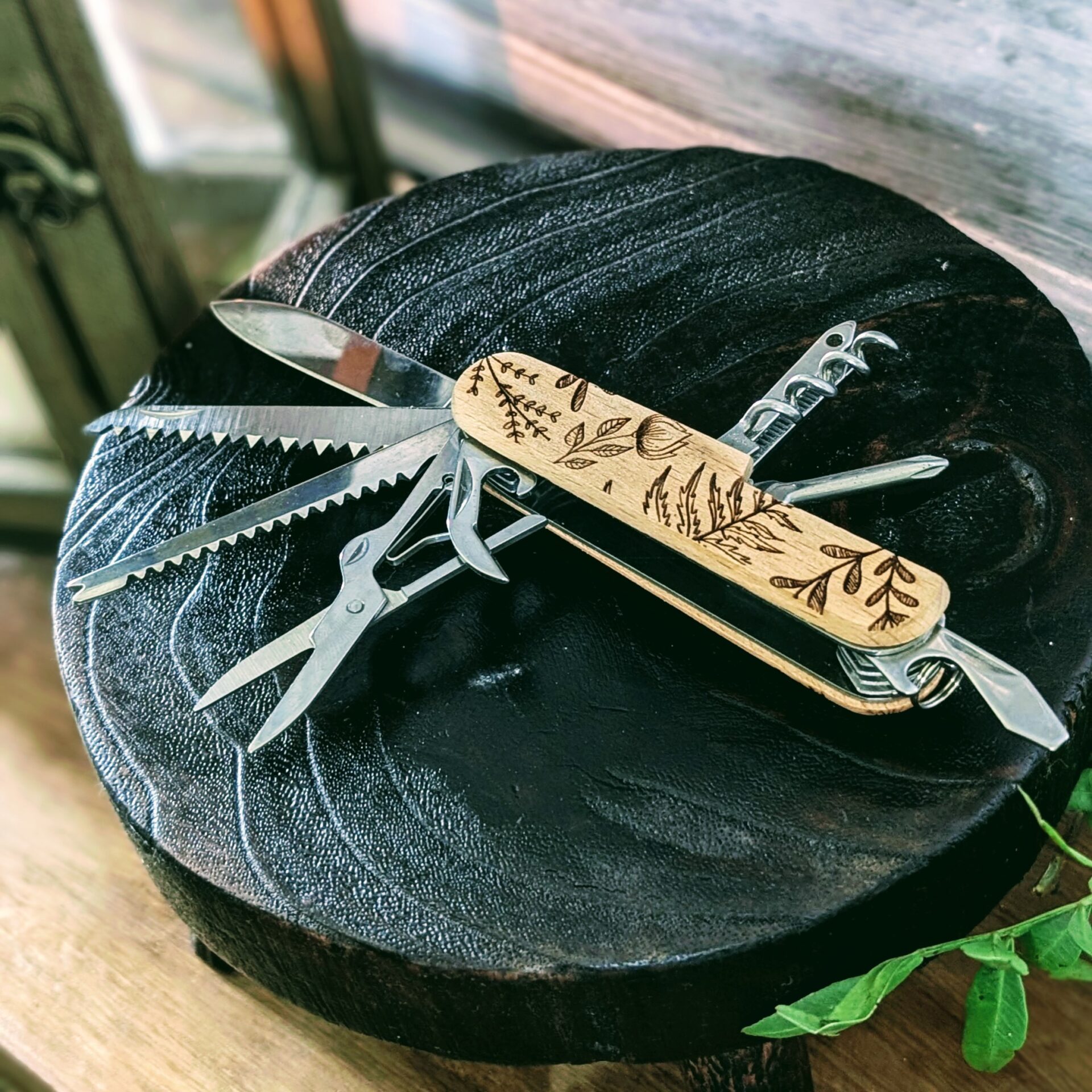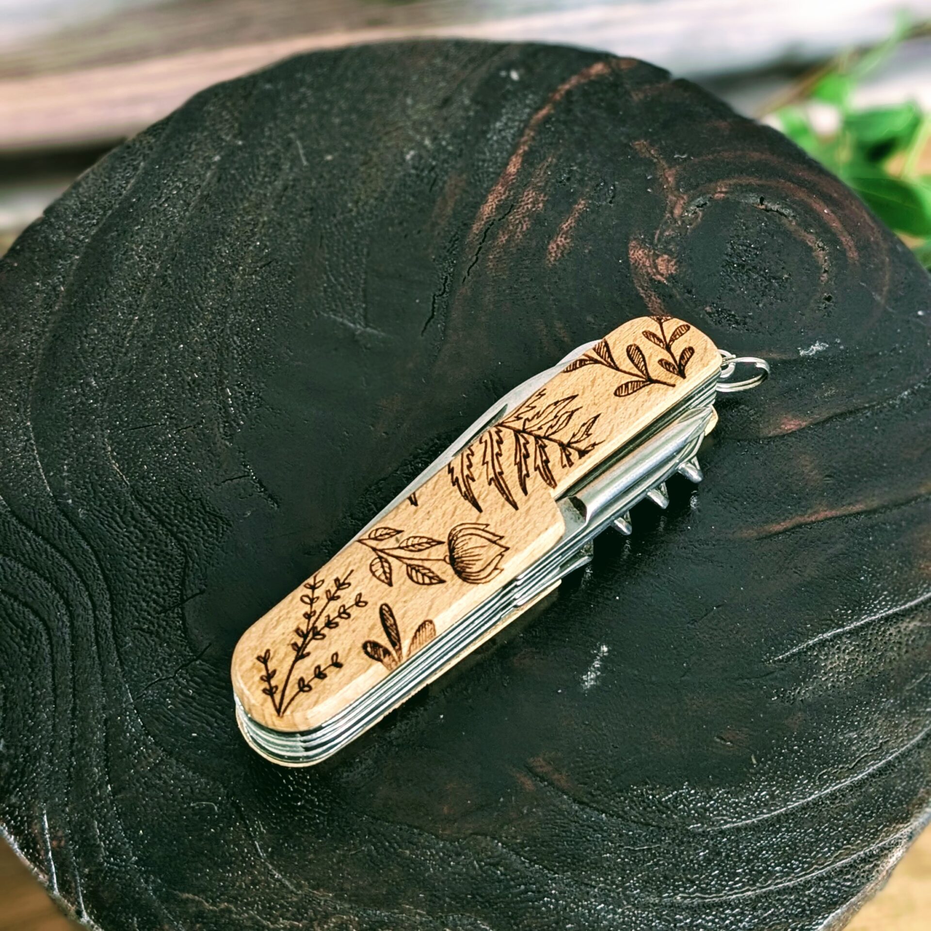 Discover the beech wood multi tool floral, an ideal gift for him or her. Stylish and practical for any occasion! Beechwood multi tools, Gift for him. Gift for her. Floral.