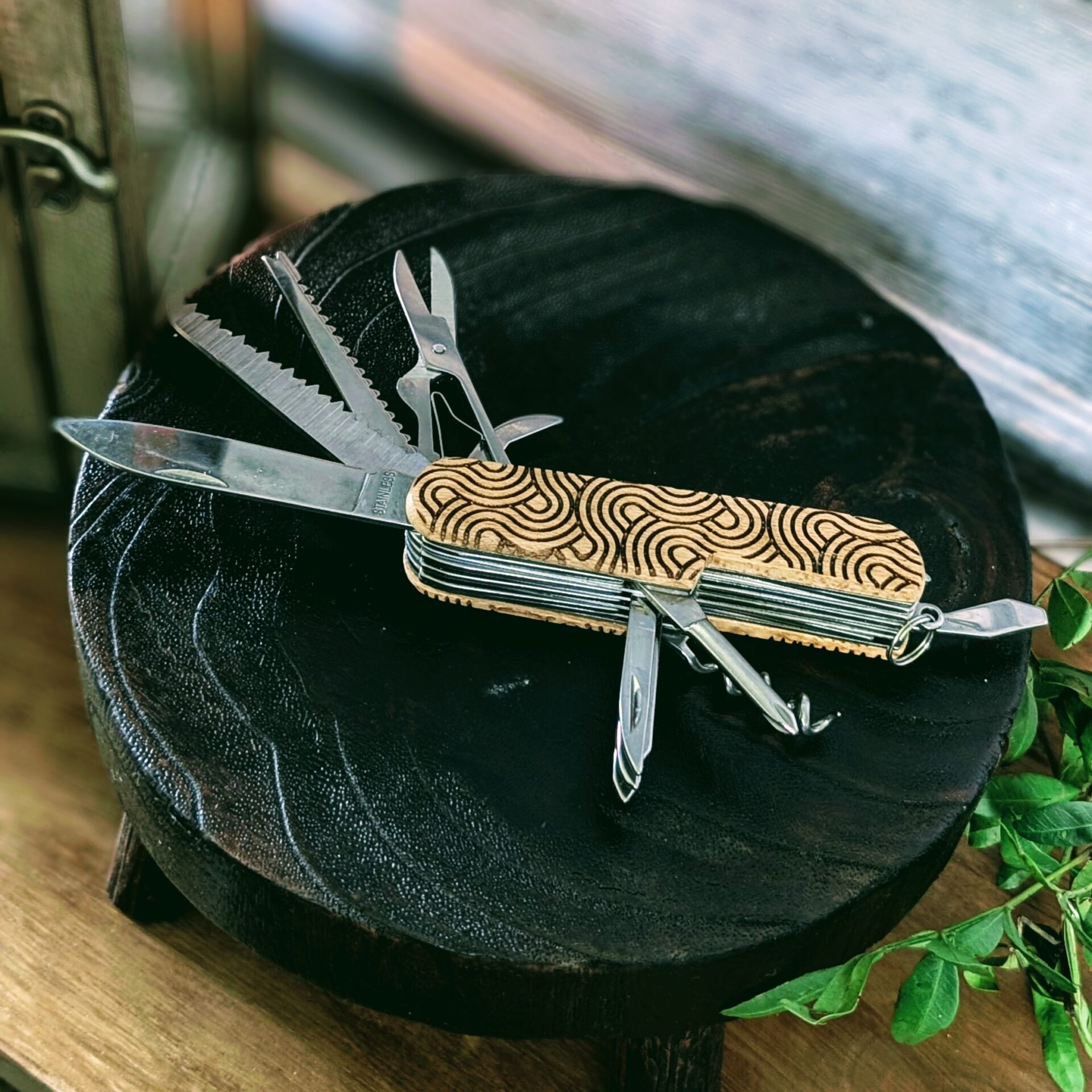 Our geometric patterned multi tool comes with lots of useful accessories, from scissors, saw, bottle opener, knife, and much more.