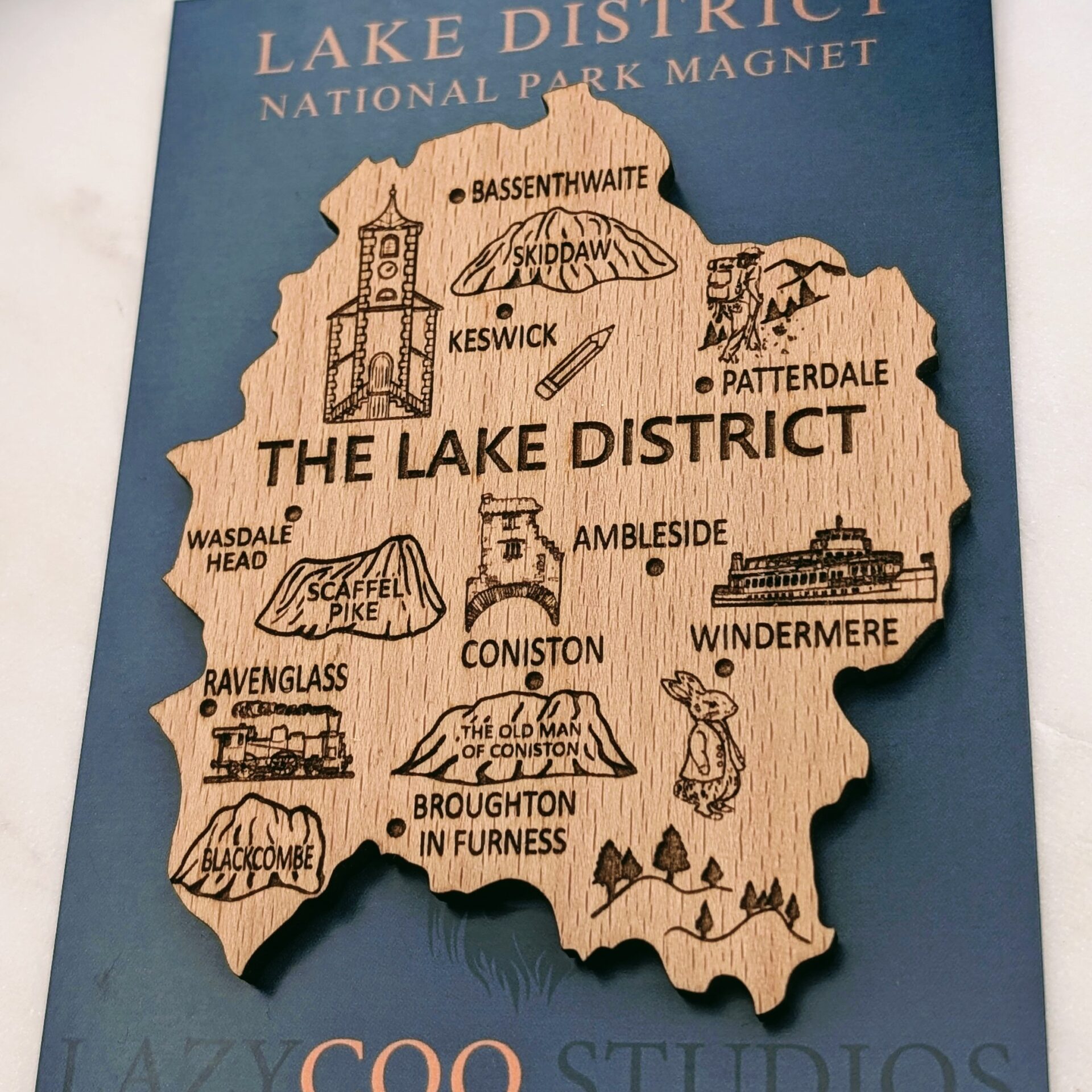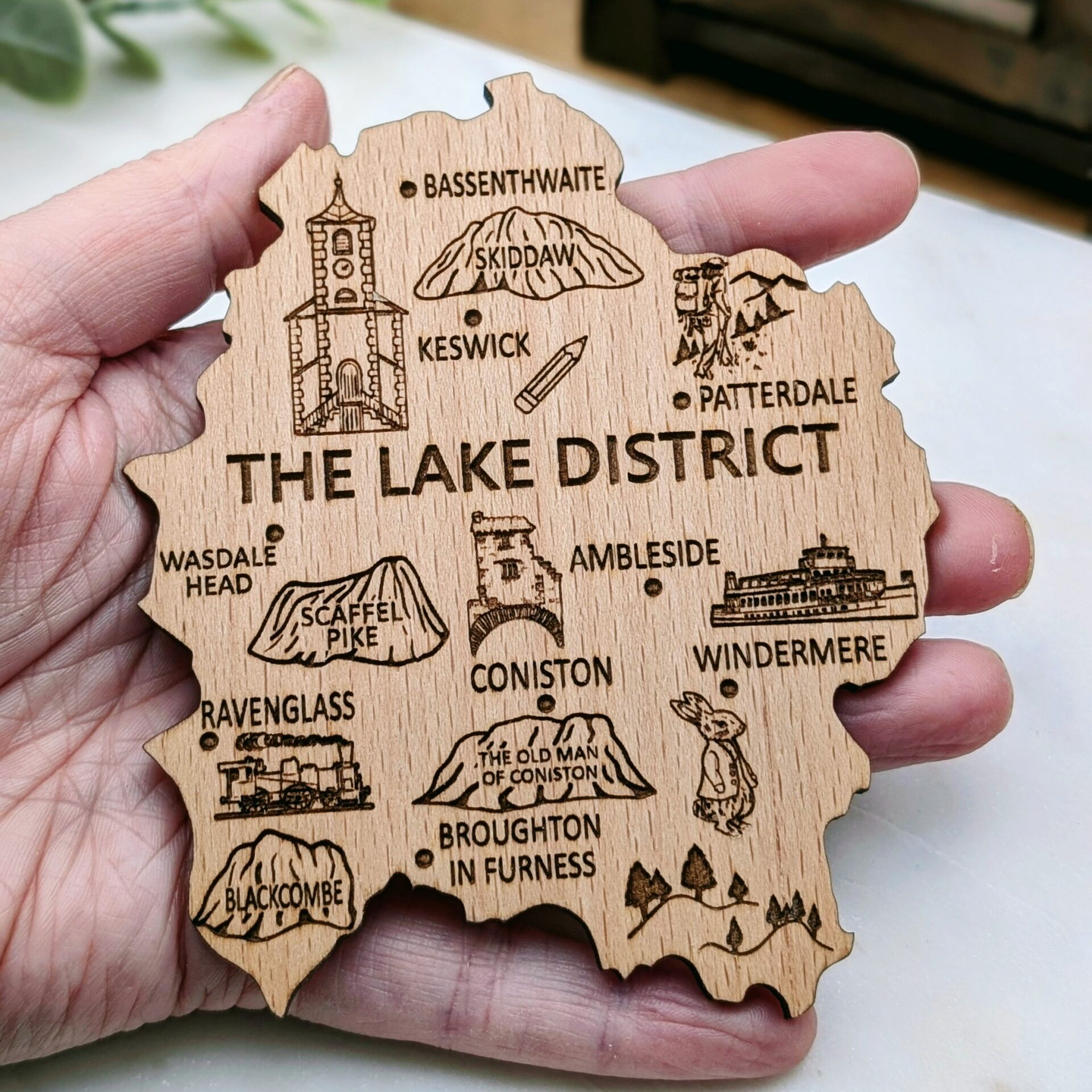 Lake District Cumbria fridge magnet. Illustrated icon art wooden magnet. Lake District souvenir gift. Lake District gift.