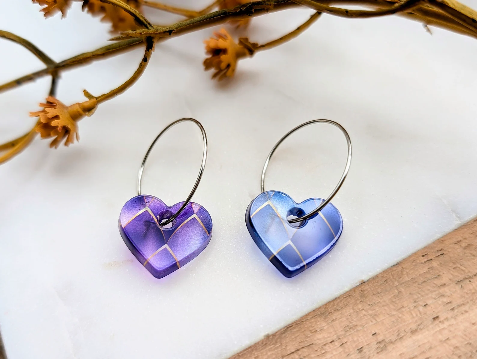 Handcrafted in our home studio, these acrylic heart hoop earrings feature a glossy finish and a two-tone design in blue and purple colours in a mermaid pattern. They are accompanied by hypoallergenic hoops available in silver or gold, ensuring a lightweight and comfortable wear. Packaged in a gift box, these hoop earrings make a perfect gift for those who appreciate minimalist jewellery.