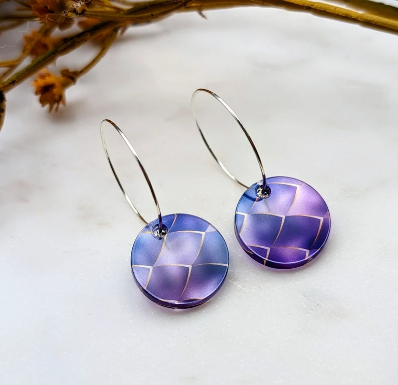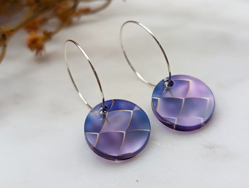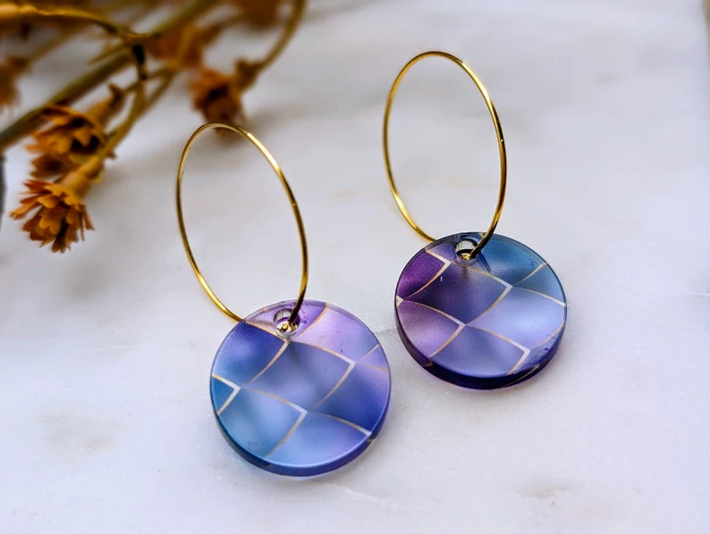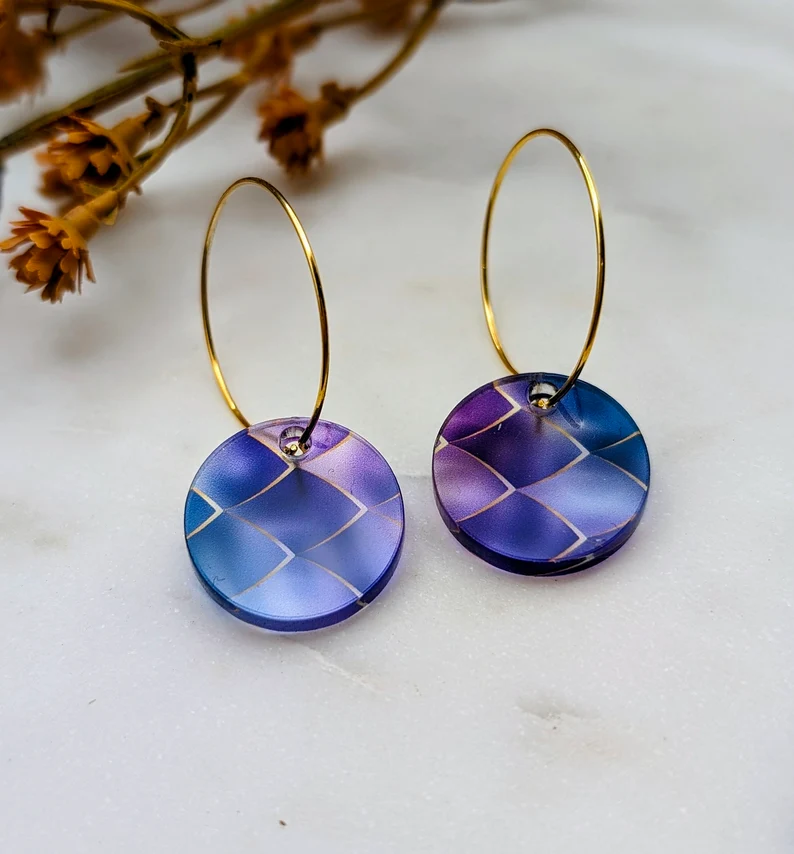 Handcrafted in our home studio, these acrylic hoop earrings feature a glossy finish and a two-tone design in blue and purple colours in a mermaid pattern.