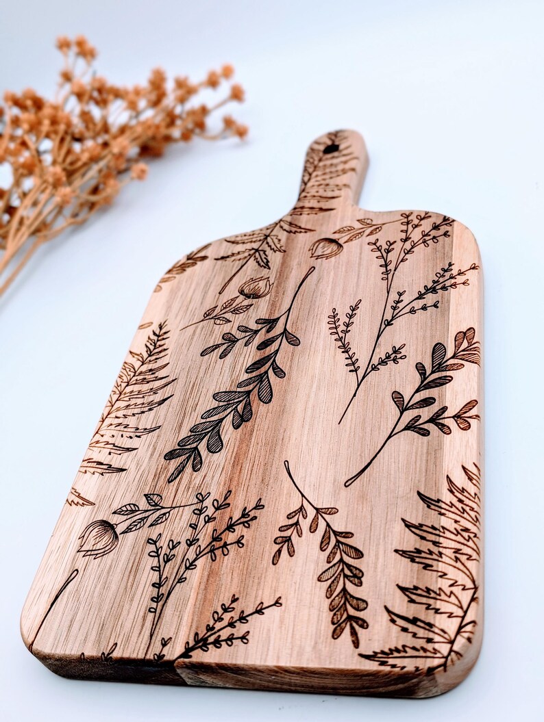 Wooden floral and leafs charcaturie board. Botanical serving paddle board. Engraved cutting board.