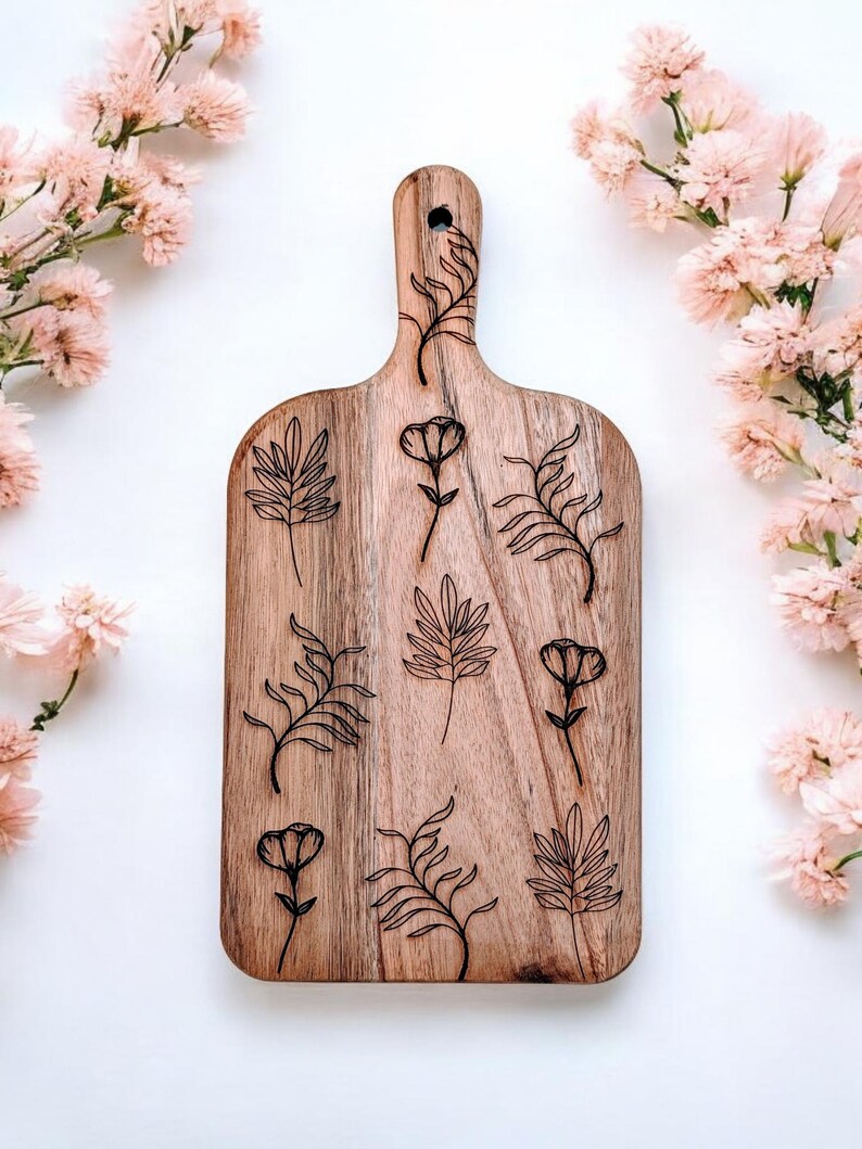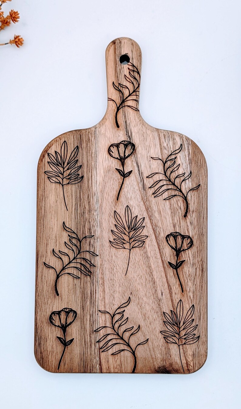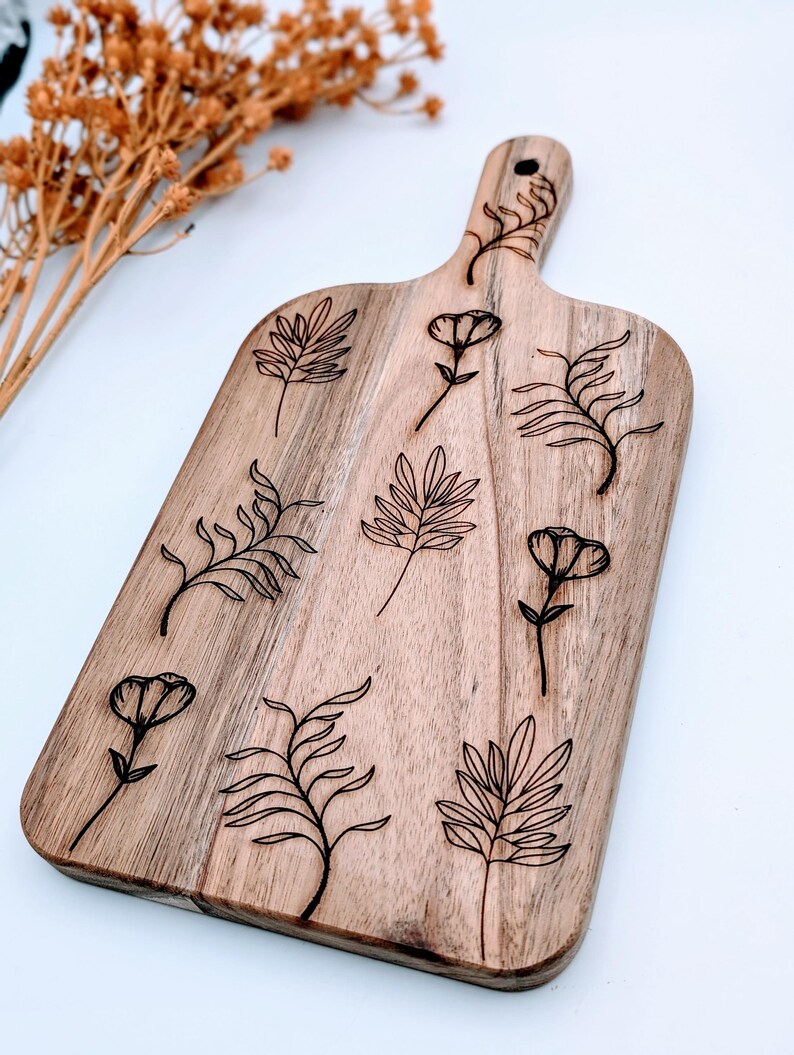 Wooden floral and leafs charcaturie board. Botanical serving paddle board. Engraved cutting board.