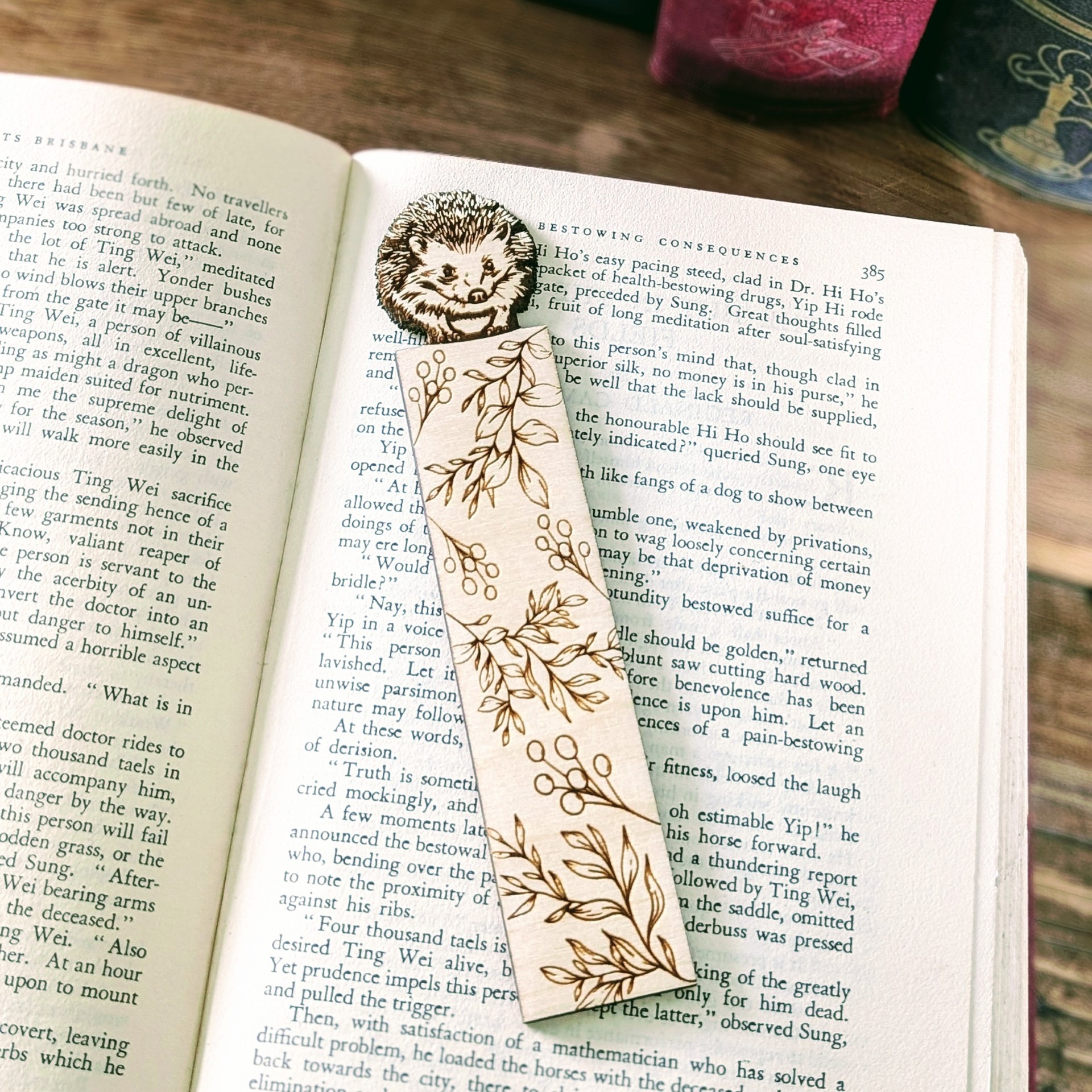 Wooden hedgehog engraved bookmark. Berries. Foliage. Autumn forest. Woodland wildlife. Eco friendly. Nature lovers gift.