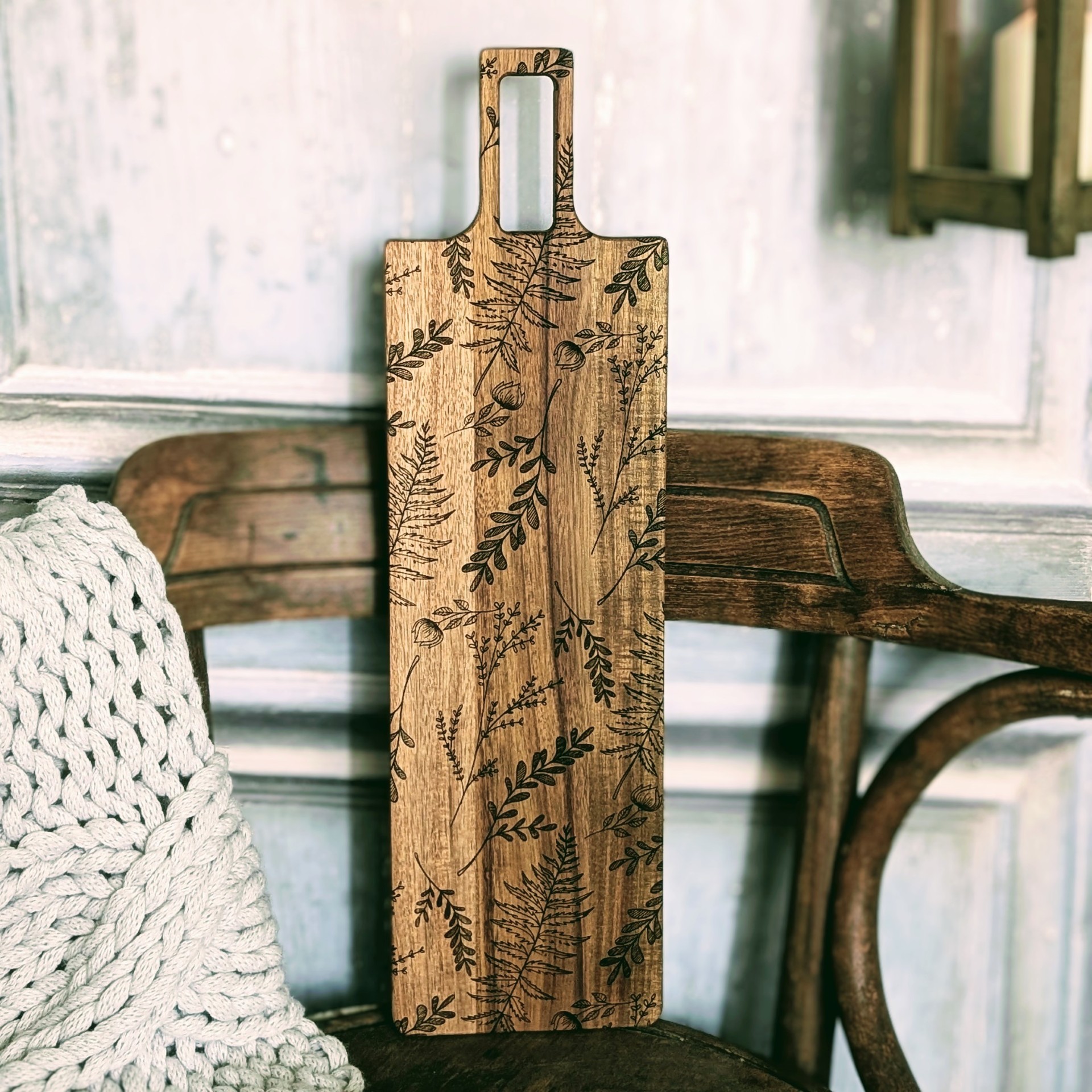 Discover the charm of ourĀ wooden meadow charcaturie board, perfect for serving and entertaining with a botanical touch. Wooden fern charcaturie board. Botanical serving paddle board. Engraved cutting board.