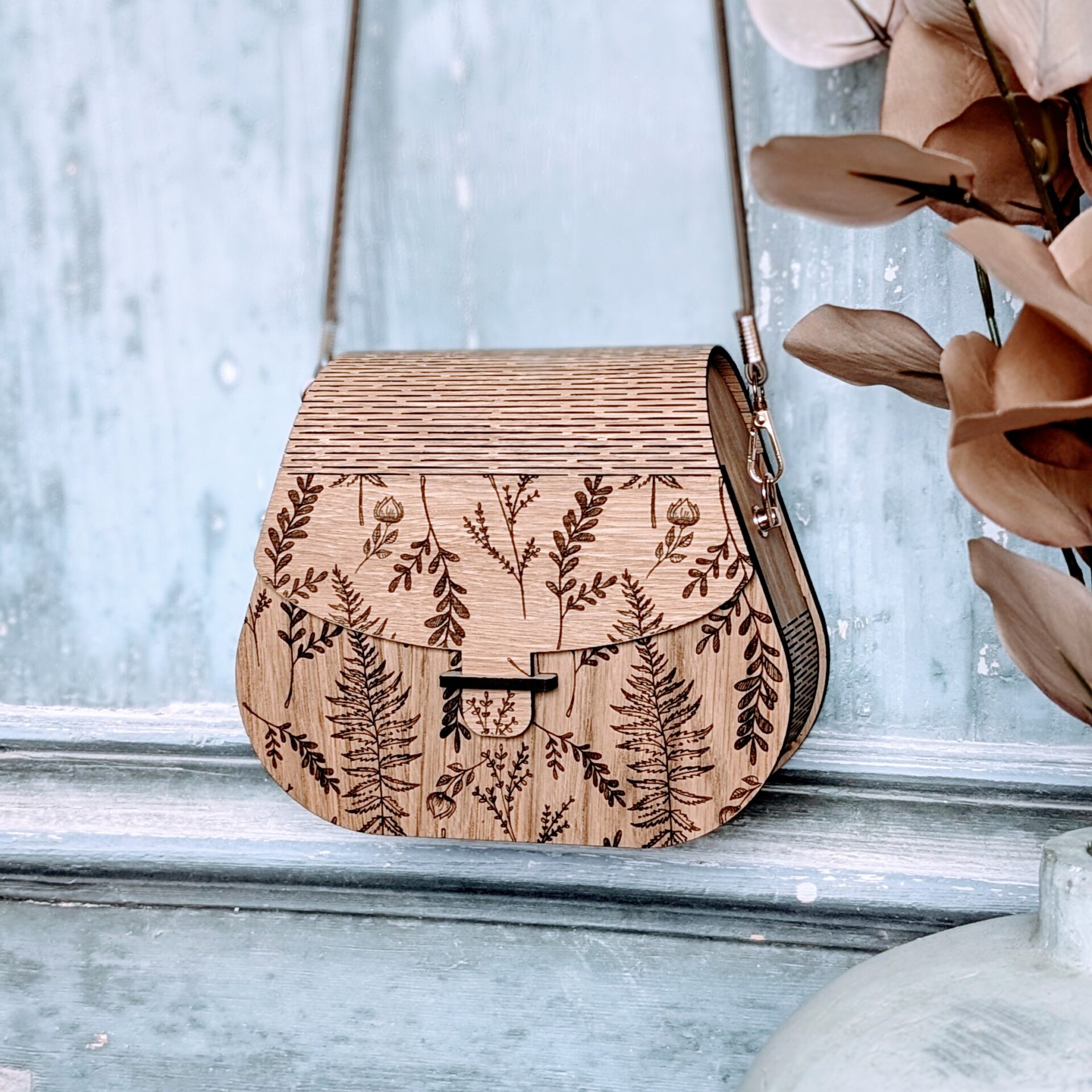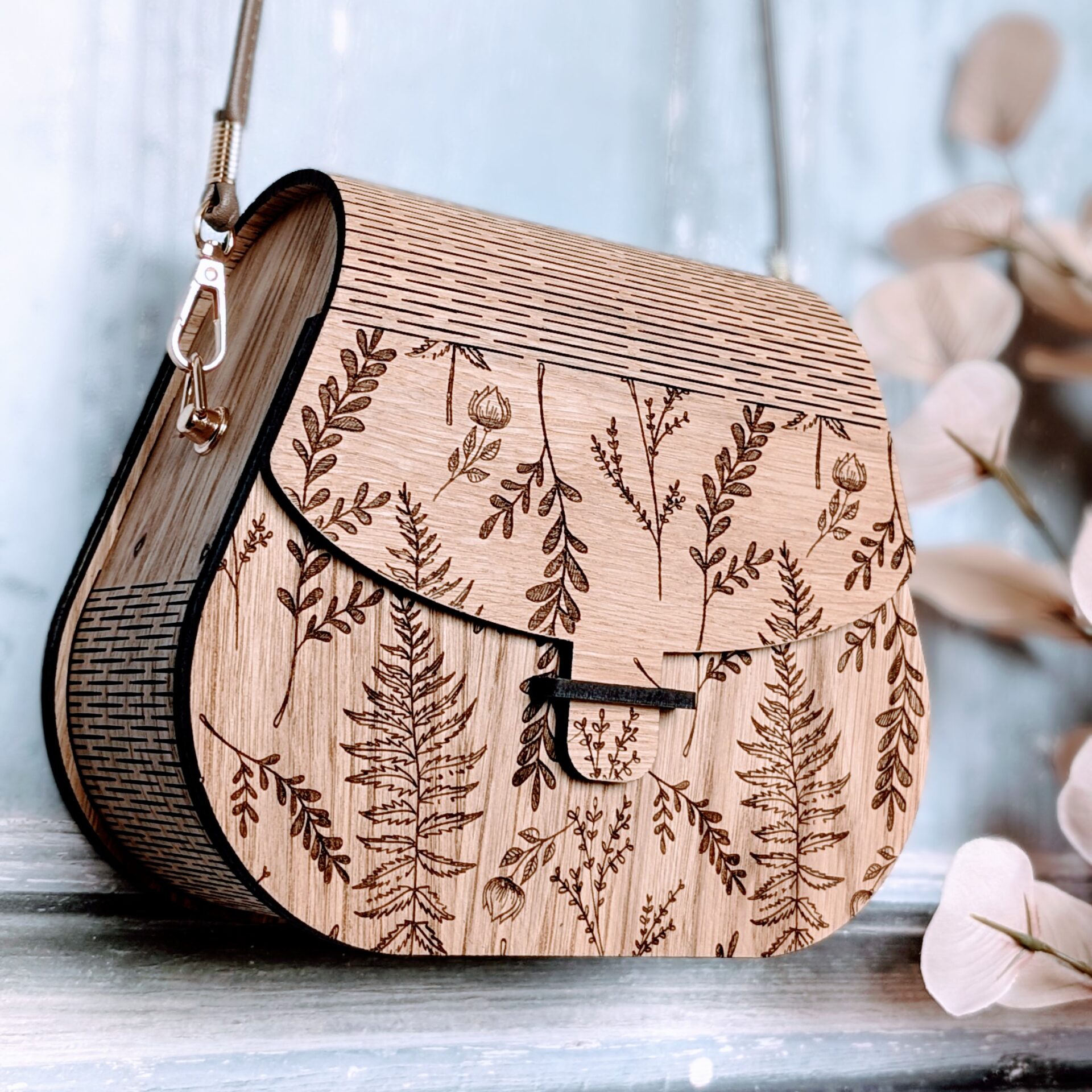 Handcrafted in our home studio by my husband and myself, this exquisite Wooden Sporran Oak Handbag Crossbody Bag is created from 4mm Oak veneer, meticulously laser-cut with a botanical design engraved on the front. It features a removable strap, it is a true statement piece.